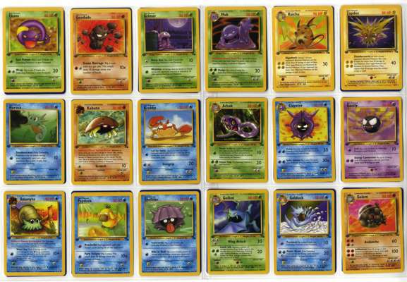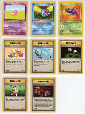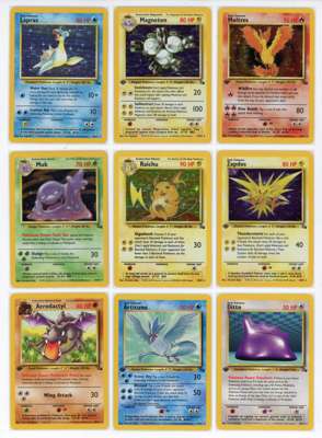 Each card is individually present and each holo has its own condition: Aerodactyl Near Mint, Articuno near mint, Ditto Mod Play, Dragonite very light play, Gengar Very Light Play (silvering around the edge), Haunter Near Mint, Hitmonlee Very Light Play, Hypno Light Play, Kabutops Near Mint, Lapras Very light play, Magneton Near Mint, Moltres Near Mint, Muk Light Play or better, Raichu Light Play (silvering around the baorder), Zapdos Near Mint. Every other non-holo rare, Uncommon and common are all in light play or near mint or better condition.