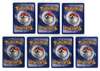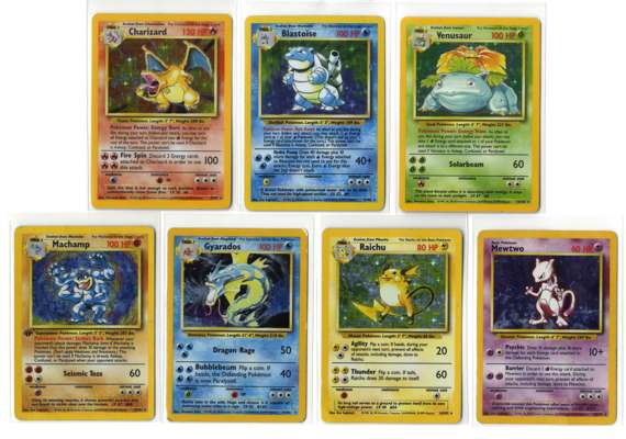 The x7 holos include: Blastoise #2 (MP), Charizard #4 (HP), Venusaur #15 (HP)…Gyarados #6, Mewtwo #10, Machamp #8, and Raichu #14.