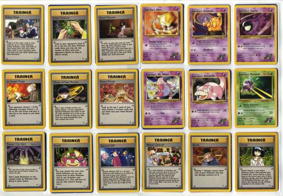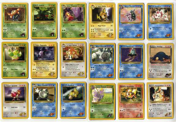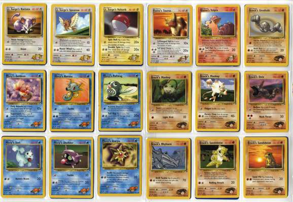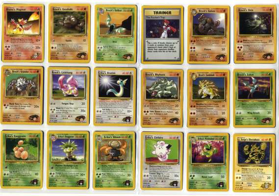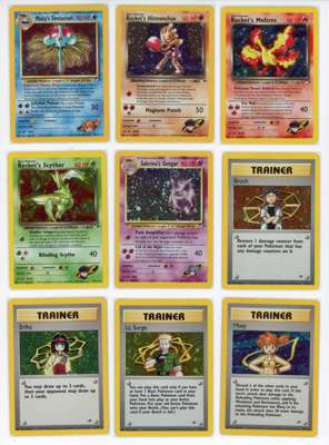 Blaine's Moltres damaged, Brock's Rhydon Very Light Play, Erika's Clefable Very Light Play Erika's Dragonite heavy play, Erika's Vileplume heavy play, Lt. Surge's Electabuzz Near Mint, Lt. Surge's Fearow heavy play, Lt. Surge's Magneton near mint, Misty's Seadra Near Mint, Rocket's Moltres Near Mint, Rocket's Hitmonchan very light play, Misty's Tentacruel Near Mint, Sabrine'a Gengar Near Mint, Rocket's Scyther near mint,