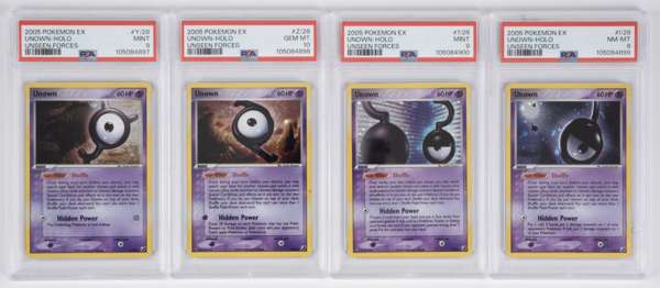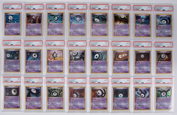 This lot features the complete 28 card Unown subset from the EX Unseen Forces expansion. This includes the full alphabet of Unown alongside the ‘?’ and ‘!’ Unown forms. Each card has been graded by PSA, achieving either an 7, 8, 9, or 10.