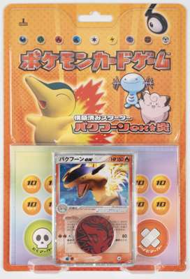 This lot features the Typhlosion ex Constructed Starter Deck, a Japanese-exclusive Half Deck Starter Deck in factory sealed condition. Only minor wear to the card packaging shows this item's age. Released in 2005, sealed decks like these are rising in popularity for sealed collectors and fans of oddities and regional exclusives.