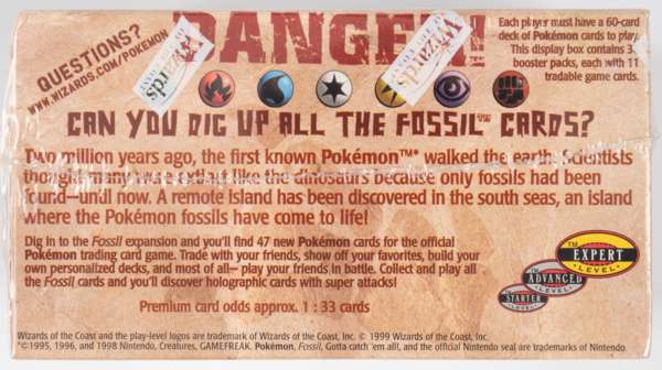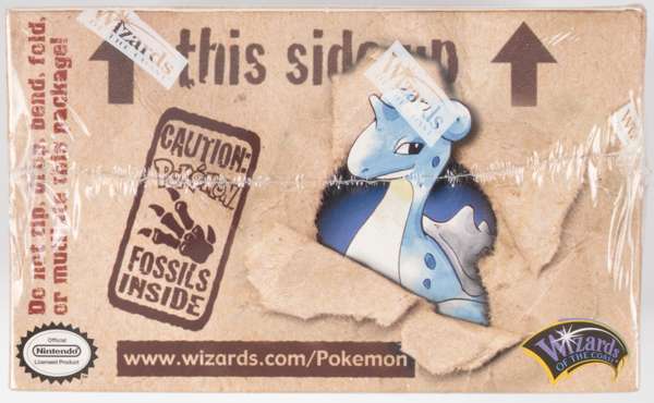 Introducing many Pokémon from the animation series, the Fossil the set contains a total of 62 cards including many coveted holos. This factory sealed booster box features the Wizards of the Coast logo and contains 36 sealed booster packs, each containing 11 cards for a total of 396 cards per box.