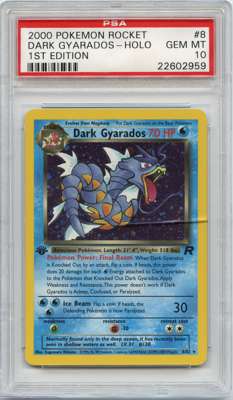 Dark Gyarados #8 holo 1st Edition from Team Rocket, graded GEM MT 10 by PSA. This stunning card has achieved the highest possible grade from PSA and as such, it looks absolutely fantastic.