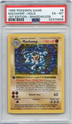 Machamp #8 holo from Base Set 1st Edition Shadowless, graded EX-MT 6 by PSA.