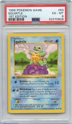 Squirtle #6 from Base Set 1st Edition Shadowless, graded EX-MT 6 by PSA.
