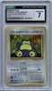 CGC 7 Hungry Snorlax N64 CD Promo Japanese 1997 trading card, a rare and unique promotional card released in Japan. Featuring Snorlax in a playful design, this card was part of a special promotion linked to the Nintendo 64. Graded 7 by CGC, it is in good condition with moderate signs of handling, making it a desirable piece for collectors of vintage Pokémon cards and Japanese exclusives.