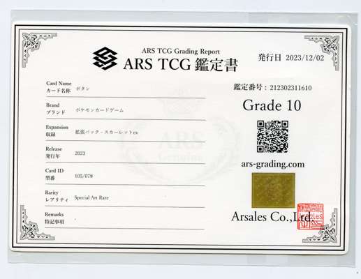 Penny #105 Pokemon Japanese Scarlet Ex, graded 10 by ARS, with included Grading Report sheet.