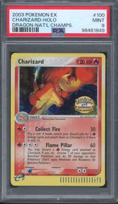 This lot contains a PSA 9 Charizard from ex Dragon, it features the National Championship stamp, which makes this already rare and sought after card that much more rare. It has been authenticated and graded by PSA and awarded a MINT 9.