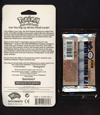 This lot contains a sealed Fossil Booster Pack featuring the Aerodactyl artwork. It comes with the original blister packaging, however the seal has come loose, the plastic cover is not attached to the cardboard backing.