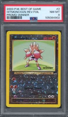 This lot contains a PSA 8 Hitmonchan from the promotional run of Best of Game series, with a Winner stamp. This card has been authenticated and graded by PSA and awarded a NM-MT 8.