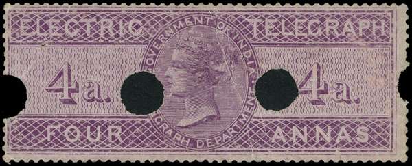 1860 Electric Telegraph, 4a reddish purple on blued paper, uncancelled but with Chief Office punches, some small creases causing surface blemishes, still fine appearance and colour, very rare, one of only five recorded used examples, with one present in the Tapling Collection. SG T1 £2000 Ex. Harmers 2013