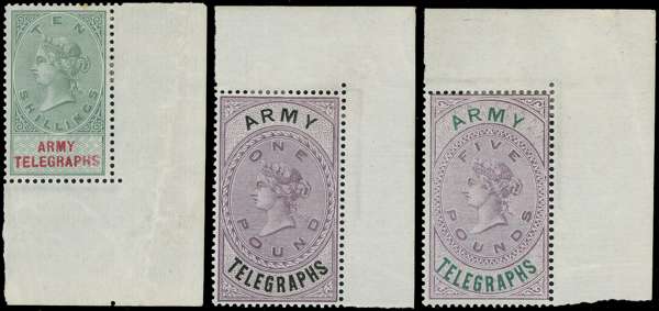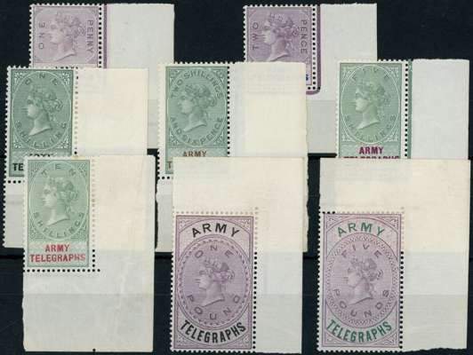Army Telegraphs. 1899-1900 1d, 2d, 1s to £5, matching upper (£1, £5) or lower right corner examples, brilliant large part o.g. Minor gum bends and marginal creases, and 10s with one toned perf, still highly attractive with lovely fresh colours. SG AT3/4, AT8/13, cat £1135.