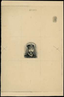 1924 Die proof of head on cream wove paper (74 x 112mm), with full die sinking, showing printer's guide marks, and reversed die number ‘10070’ at top, matching the die number which was later used for the day book proofs proving this to be the finished portrait for the issue. A wonderful and highly attractive proof.