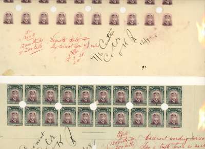 1924 file sheets(2) for the 7/6d value. the first vignette only, the second the complete design, both in blocks of TWENTY (10x2) comprising the bottom two rows of the sheet with full margins, security punch at centre of each block of four, both with various ms notations in the margin, the vignette with "Vignette plate & lay correct for 7/6 value" in red ink and "7/6 Cents Colour OK", the complete design with "Correct Colour OK" and "Casement wording correct. Lay a trifle lower as marked" in red ink. A spectacular and unique Archival record. Mewett 215 plate proof