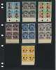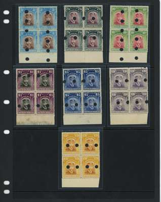 1924 set of perforated plate proofs of the finished design, 3s to £20, complete set of seven values (the £50 not recorded in this form) without gum, each in a lower marginal block of four with characteristic security punctures and archival blemishes. Attractive and scarce in blocks. As Mewett 214-221