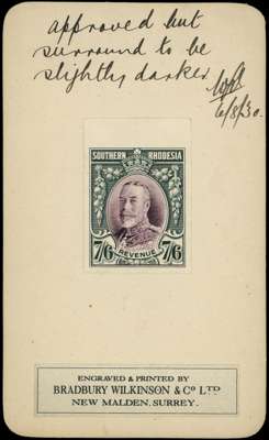 1930 7s6d black and purple, imperforate colour trial affixed by upper margin to Bradbury Wilkinson presentation card (63x104mm), endorsed ‘approved but surround to be slightly darker’ initialled, and dated ‘6/8/30’ in black ms. A most attractive proof which provides an insight into the production process.