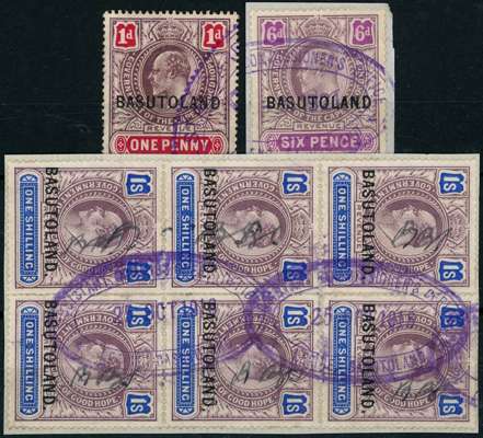 c.1912 23mm x 3mm ‘BASUTOLAND’ overprint on KEVII Cape revenues (6s on ORC), 1d to £1 part set of eight, (missing only the 2s6d for completion), each fine used with part oval ds, also 1s block of six on document piece and 1d and 6d showing ‘NO STOP’ variety. A scarce group in excellent condition. (From) T&M 13.1/.3, 13.5/.9.