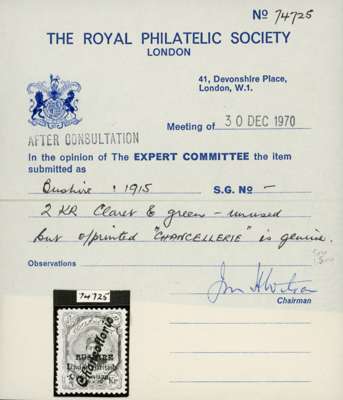 Customs: 1915 2kr claret and green, overprinted ‘Chancellorie’ for use on import documents, large part o.g. the 2kr fee covering import fees for 12 bags of rice during the British occupation. A very rare Commonwealth revenue with few examples recorded.