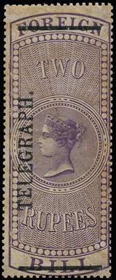 Telegraph. 1900 (24 Feb) 2r purple "FOREIGN BILL" with type T37 "TELEGRAPH." opt, mint, large part o.g. Some typical surface deterioration (the fiscal stamp having been printed 39 years previously), still fine for this distinctive rarity. SG T53, £600.