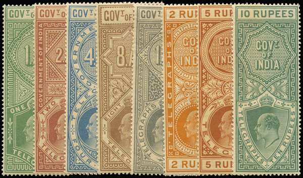 Telegraph. 1904 KEVII short set of 8 to 10r, mint, large part o.g. to o.g. Odd trivial blemishes (shortish perfs, 2r gum wrinkle) and a few values to 5r with yellowish gum, still a fine and attractive set, with the scarce 10r far above average. SG T56/63, £491.