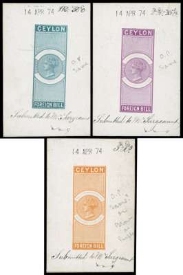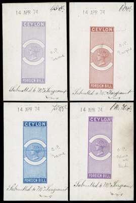 1874 (14 Apr) Foreign Bill Revenue, complete set of ELEVEN undenominated MASTER DIE PROOFS for the 1874 Foreign Bill issue in issued colours on glazed card, four attached to the original annotated piece from the De La Rue day book, (241x115mm), the remaining seven neatly cut from the document for display (each 60x92mm). Each proof with handstamped date ‘14 APR 74’ and m/s annotations ‘Submitted to Wm Sargeaunt’ (then Crown Chief Agent), and the proposed face value in the upper right corner, further annotated in pencil next to the portrait with Sargeaunt’s proposed colours for text and value. Each recommendation made was subsequently adopted for the 1874 set, apart from the 1R20, for which Sargeaunt’s colour proposal of ‘o.p Blue or Red’ was changed to the issued green. A spectacular and unique assembly of working proofs, documenting the final stages of the approval process for this attractive and long-running series of revenues. An essential showpiece for any exhibitor. Ex De La Rue archives.