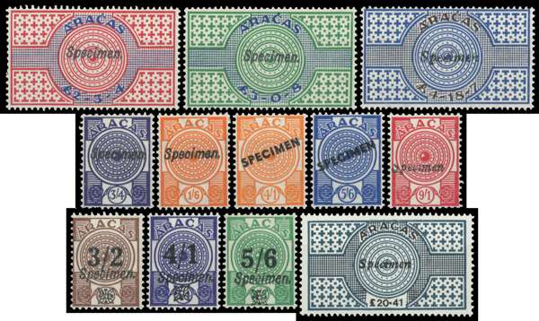 National Insurance. 1952 1/6d, 3/4d, 4/1d, 5/6d, 9/1d, £2/3/4, £3/0/8, £4/18/7; c.1950 Provisionals 3/2d on 2/6d, 4/1d on 3/4d, 5/6d on 4/8d; 1973 £20.41. The higher values in larger format. Twelve stamps, all overprinted SPECIMEN or ‘Specimen’, unmounted o.g.
