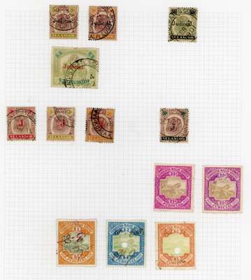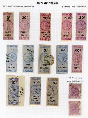 Revenue. 1874 set less the 5c, 10c and $4 values, used. Some faults, mainly soiling and creasing. The $10 is fine, the $25 soiled with a small tear at top; the rare $50 is on piece, with a lovely Malacca datestamp, but is also soiled, has minor creasing and buckling at the top left corner. Also 1882 nine values to $2, 1888 seven values to $5, a few Selangor “Judicial” and “J” overprints and five 1900 FMS Judicials