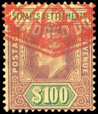 Revenue use. 1903 $100 purple and green on yellow paper, used with red fiscal cancel, fine. SG 122, £250