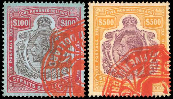 Malaya Straits SG 214, 215 1912 $100 and $500 fiscally used