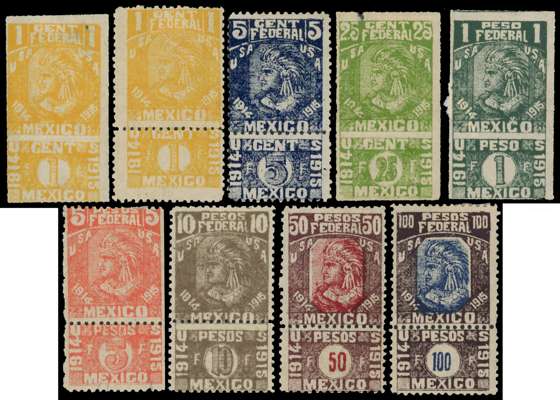 US Occupation of Vera Cruz Revenue 1914-15' Native with feather head dress' mounted mint selection (all with Talon) comprising 1c bright yellow imperf and perf 12 all round, 5c blue perf 12 all round, 25c yellow-green & 1p green rouletted, 5p orange-red perf 12 horizontally, and 10p gray, 50p brown & carmine and 100p black & blue each perf 12 all round. Faults from careless mounting to the lower values, though the key 10p, 50p and 100p very fine indeed, the two high values major rarities with few examples recorded. US51/58. cat $1,100+