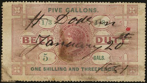Beer Duty: 1880 Second Issue 1s3d rose and green, wmk sideways inverted NZ, neatly cancelled with ''H Dodson/ January 20th 1881' ms cancel in black. Lower left corner with closed tear and usual staining and imperfections, still much above average and a fine example of this elusive stamp. Kiwi R18B