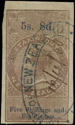 NEW ZEALAND 1867 Revenue QVLT 1867 5s 8d grey-brown and blue, wmk small NZ REVERSED