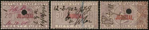 CEYLON 1896 Revenue Judicial: 1896-98 20r, 50r and 100r lilac local overprints