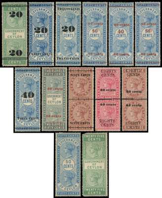 1881-94 collection of 13 mint singles, including 20c surcharges (2), 40c (4), 60c (2), and 80c (2), with unsurcharged 25c and 50c. Usual gum blemishes (odd toning etc), still a presentable and attractive group. S.G. T30 T34, T35, T50, T53 x3, T73, T81, T85, T108 cat £1,000+