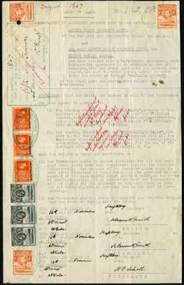 Revenue. 1945 (5 Jan) typewritten 'DEED OF SALE' document, relating to the purchase of two trading stations for a total of £7000, bearing and 1940 KGVI £5 orange opt on South Africa x3 (pair and single) in conjunction with 1933 KGV Revenue £1 black horizontal strip of 3 and 1938 Postage 1s red-orange x3, all tied by several strikes of 'REGISTRAR OF THE HIGH COURT / MASERU, BASUTOLAND' oval ds in green with matching boxed H/S alongside (dated and signed by the Government Secretary). Horizontal filing folds (affecting one £5 and one £1) and odd minor blemishes, still far above average with two of the key £5 remaining very fine.