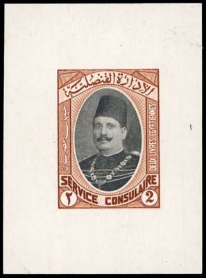 Consular Service: Revenue Essay by Harrison & Sons, 1922 King Fuad £2 colour essay in red-brown and grey-black by Harrison & Sons in 47x64mm sheetlet, very fine and rare, see Peter R. Feltus book p.181. The portrait of the King is the same as the one used for the £1 1924 definitive stamp.
