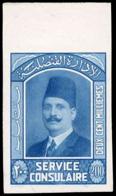 Consular Service revenue: 1922 King Fuad 200m colour essay in blue by Harrison & Sons, a lower marginal example, very fine and scarce, see Peter R. Feltus book p.181.