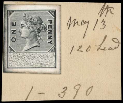 Unappropriated Dies. c1872 stamp-sized 1d Die Proof in black on glazed card, on piece cut from the De La Rue Striking Book, marked ‘120 Leads’. One tiny surface blemish, otherwise fine. Unique