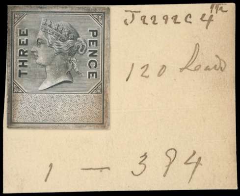 Unappropriated Dies. c1872 stamp-sized 3d Die Proof in black on glazed card, on piece cut from the De La Rue Striking Book, marked ‘120 Leads’. A little discoloured at the periphery, some of which may be due to scorching following the bombing of DLR's works in 1941. Unique