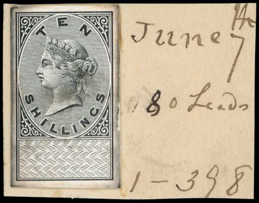 Unappropriated Dies. c1872 stamp-sized 10s Die Proof in black on glazed card, on piece cut from the De La Rue Striking Book, marked ‘800 Leads’. Some burnishing, and marginal surface fault at right; unique