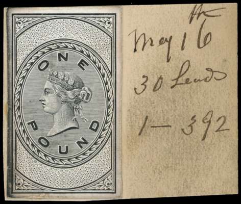 Unappropriated Dies. c1872 stamp-sized £1 Die Proof in black on glazed card, on piece cut from the De La Rue Striking Book, marked ‘30 Leads’. Burnishing at left, the piece with some soiling, fine and unique