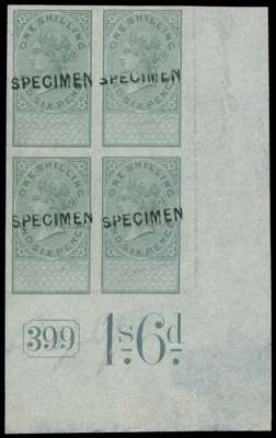 Unappropriated Dies. 1872 1s6d green, watermark Block VR, lower right corner imperforate block of four with Current Number 399 and denomination below the last stamp. Each stamp handstamped SPECIMEN Type 6A, proving this to be from the De La Rue Colour Standard sheet. Archival mounting at base, which is light, the stamps fresh and fine unmounted o.g., a unique positional multiple
