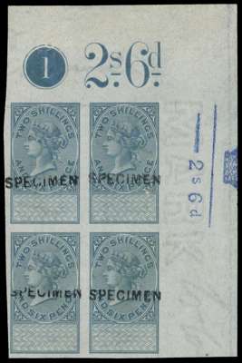 Unappropriated Dies. 1872 2s6d green, watermark Block VR, upper right corner imperforate block of four with Plate Number 1, denomination above upper right stamp and blue handstamp with Crown and face value on right selvedge. Each stamp handstamped SPECIMEN Type 6A, proving this to be from the De La Rue Colour Standard sheet. Archival mounting at top, otherwise fresh and fine unmounted o.g., a unique positional multiple