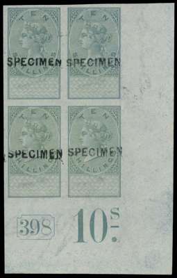 Unappropriated Dies. 1872 10s green, watermark Block VR, lower right corner imperforate block of four with Current Number 398 and denomination below the last stamp. Each stamp handstamped SPECIMEN Type 6A, proving this to be from the De La Rue Colour Standard sheet. Fresh unmounted o.g., a unique positional multiple