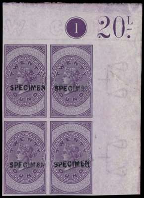 Unappropriated Dies. 1872 £20 violet, watermark Scales, upper right corner imperforate block of four with Plate Number 1 and denomination (ornate "20L.") above upper right stamp. Each stamp handstamped SPECIMEN Type 6A, proving this to be from the De La Rue Colour Standard sheet. Archival mounting at right, which is light, otherwise fresh and fine unmounted o.g., a spectacular and unique multiple