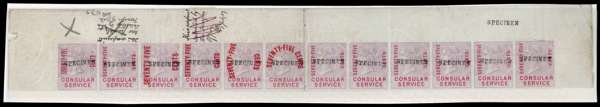 Consular Service. 1887 75c on 8d imperforate top row of the sheet, plate proof of the trial setting. The first six stamps show the six surcharge essays se-tenant, the second six showing the same surcharge as position 2 (as eventually selected), each overprinted SPECIMEN Type 9. The selvedge shows manuscript ‘This overprint selected by the Foreign Office 1 July 87’ above the fourth stamp; this was crossed out, and ‘This overprint now finally selected by the Foreign Office 15.7.87’ above the second stamp. Several folds, but a wonderful and unique piece with splendid provenance