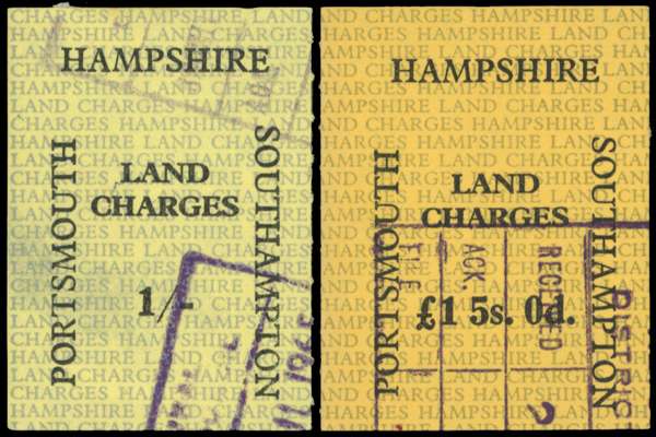 GB. Hampshire Land Charges. 1962 1s black on green and £1.5.0d black on lemon, used