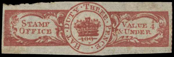 Hat Tax. 1784 3d red-brown (for hats retailing 4s and under) on thin creamy laid paper, Die 109 Recut 1. With dividing line on the right side and rough separation at the top left edge. Faint vertical crease, but far above average for this delicate and very rare early issue. Booth 1, rarity F
