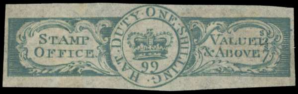 Hat Tax. 1784 1s green (for hats retailing above 7s and not over 12s) on thin creamy laid paper, Die 99. A very rare stamp, probably unique. Booth 3, rarity F (with the colour not referenced)
