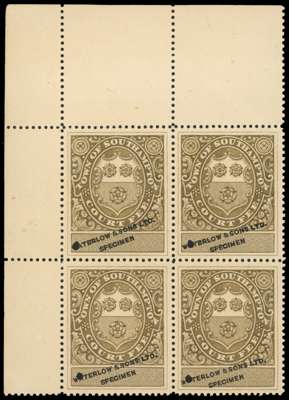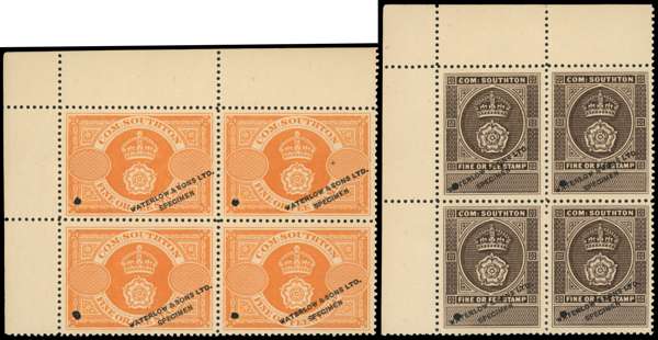 Local Authority (Southampton): Set of undenominated printer's samples in upper left marginal blocks of four, each opt 'WATERLOW & SONS/ SPECIMEN' the pence value design in olive-bistre, the shillings in brown and the £1 values design in orange. Attractive and scarce.